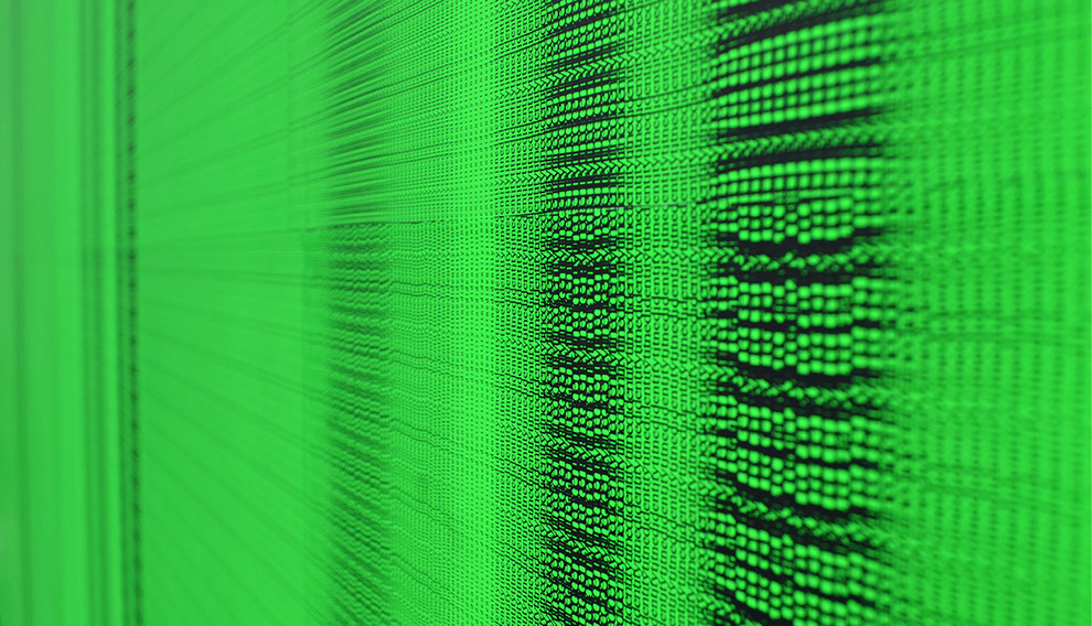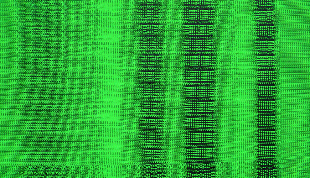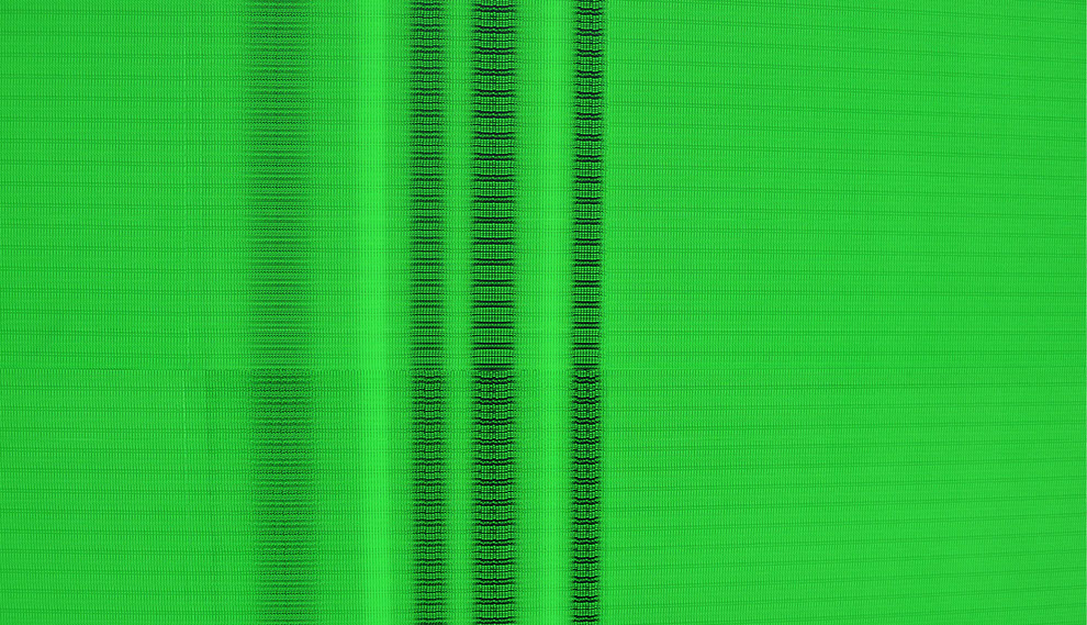 Mit dem Grauwert lenkt Probst unsere Aufmerksamkeit auf die bloße graphische Physis der Zeichen, die zu puren Graphemen werden, ein fraktal-wogendes Grau-Material, ein optisch-oszillierendes Rauschen. „IdentitytitnedI“ visualisiert dieses Rauschen, das jeder Sinnbildung, jeder Identitätsstiftung vorweg geht. Die zum Einsatz gekommenen Zeichen interessieren nur noch in ihrer externalisierten Form, in ihrer entäußerten Morphologie. Sie besetzen in einer gleichsam hypertrophen Invasion eine graphische Fläche. Es bleibt: die reine Materialität der Schrift. Probst macht es uns schwer, dieses graphische Gebilde überhaupt nur zu beschreiben, da die allermeisten Begriffe sofort unter Sinnverdacht fallen. Handelt es sich bei „IdentitytitnedI“ doch eher um einen zufälligen Ausschnitt einer an sich bedeutungslosen Matrix – ein randomisiertes Netzwerk, das über keine sinnvolle Formel über einen möglichen Zusammenhang des Ganzen und seiner Teile mehr verfügt. Mit der endlosen Wiederholung immer derselben Buchstabenfolge probt Probst den „Aufstand der Zeichen“, wie ihn Jean Baudrillard 1978 in „Kool Killer“ propagiert hat. In der demonstrativen Wiederholung sinnentleerter Zeichen hoffte Letzterer auf eine radikale Subversion der Sprache. Probsts Schrift-Pattern folgen jedenfalls keiner inhaltlichen Evidenz, sondern allein einer aleatorischen Logik. Evident ist allenfalls, was aufdringlich zwischen den Zeilen steht: nämlich ein leuchtendes Fluorgrün.