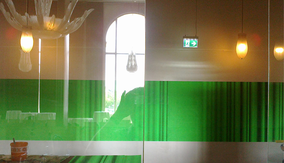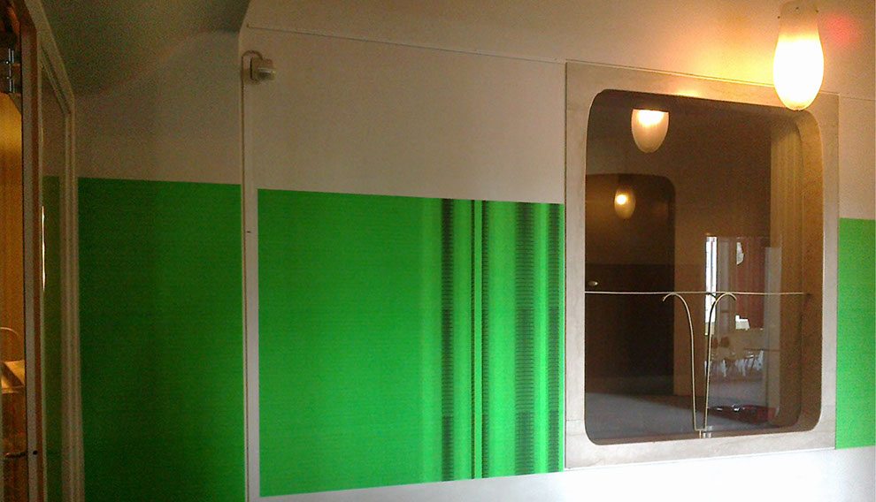 IDENTITYTITNEDI, Grauwert Nr. 30, Zweifarbiger Siebdruck, schwarz und fluo-grün auf Papier auf Wand, 2015