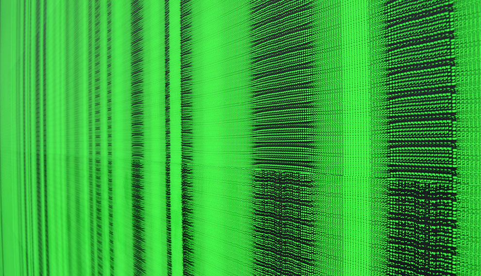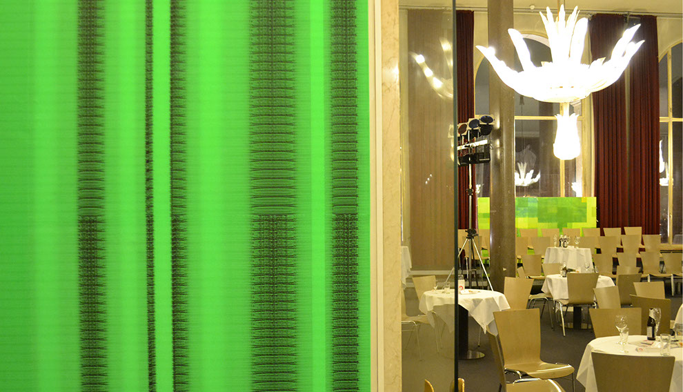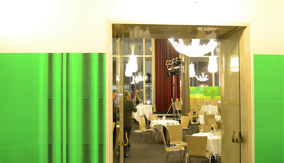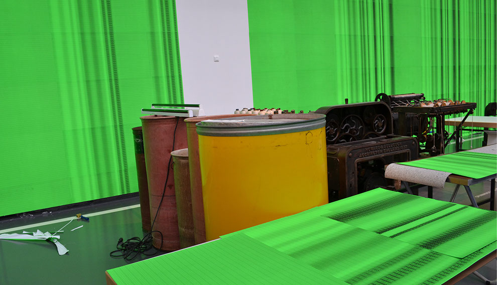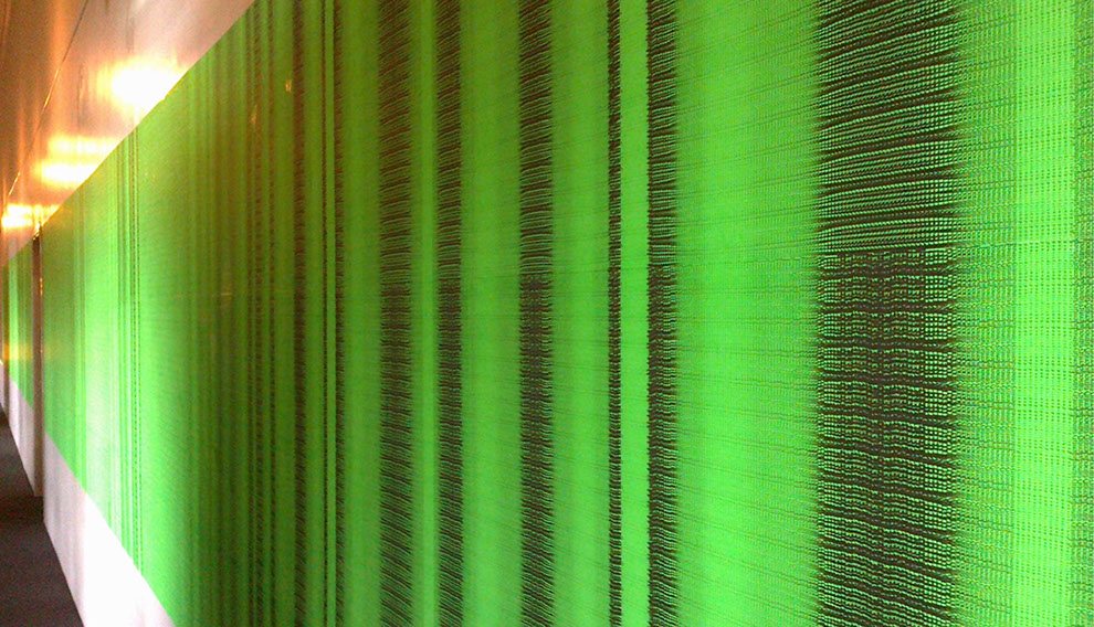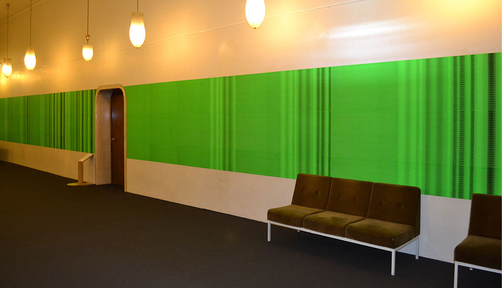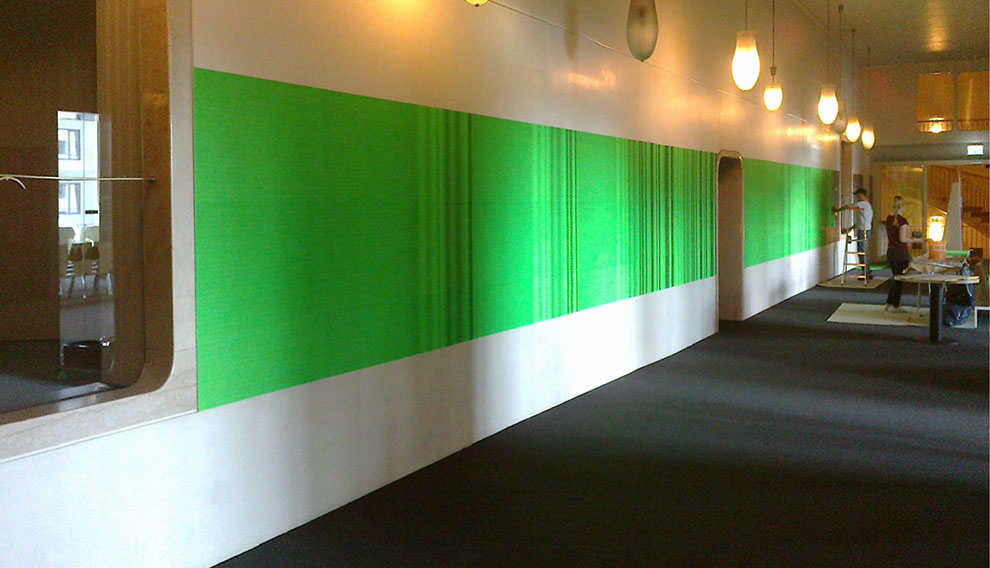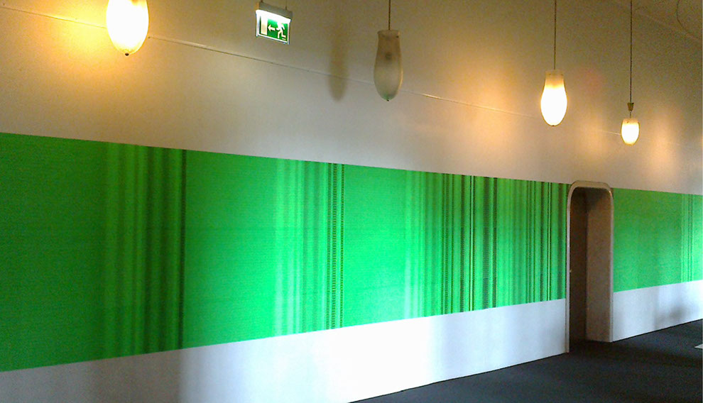Olaf Probst ist ein Meister der Dekonstruktion von Sprache, deren aporetische Paradoxien er schonungslos offenlegt. Aus der Distanz besehen, erscheint das großflächig tapezierte Werk „IdentitytitnedI, Grauwert Nr. 30“ wie ein leuchtend grüner Farbvorhang, der sich in seinem Verlauf von links nach rechts immer stärker in Falten legt. Je näher der Betrachter indes auf diesen Vorhang zugeht, desto ornamentaler schält sich das, was zuvor allenfalls als verwehter Grauschleier sichtbar war, als feine Musterung dieser künstlerischen Arbeit heraus. Aber erst in der Nahsicht offenbart sich die Grundstruktur der Musterung, die sich aus dem vertikal gekippten und zugleich gespiegelten Wort „Identity“ bildet. Mit digitaler Hilfe hat Probst an verschiedenen Stellen die Folge der Buchstaben in Größe und im Abstand zueinander verändert, wodurch sich die Schrift wiederholt vertikal und horizontal verschiebt. An diesen Stellen ergeben sich optische Verwerfungen, Verdichtungen, Rhythmisierungen, Faltungen, die im Ergebnis ein eindrucksvolles Beispiel visueller Poesie bieten. Trotz der in einem binären Schwarz-Grün angelegten Optik dominiert ein relativer Grauwert die Ansicht, die auf einer spezifischen Verteilung von Dunkel-Hell basiert. Mit dieser Beobachtung korrespondiert der gewählte Untertitel der in Rede stehenden Arbeit, die folglich der von Probst seit 1995 geschaffenen Werkgruppe „Grauwerte“ zuzuordnen ist.