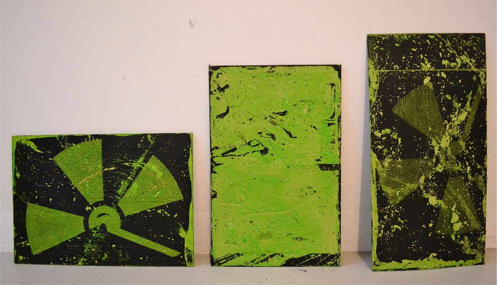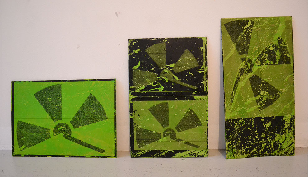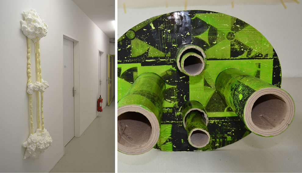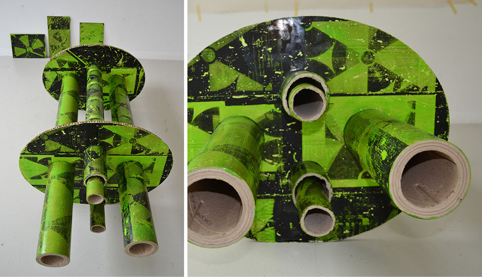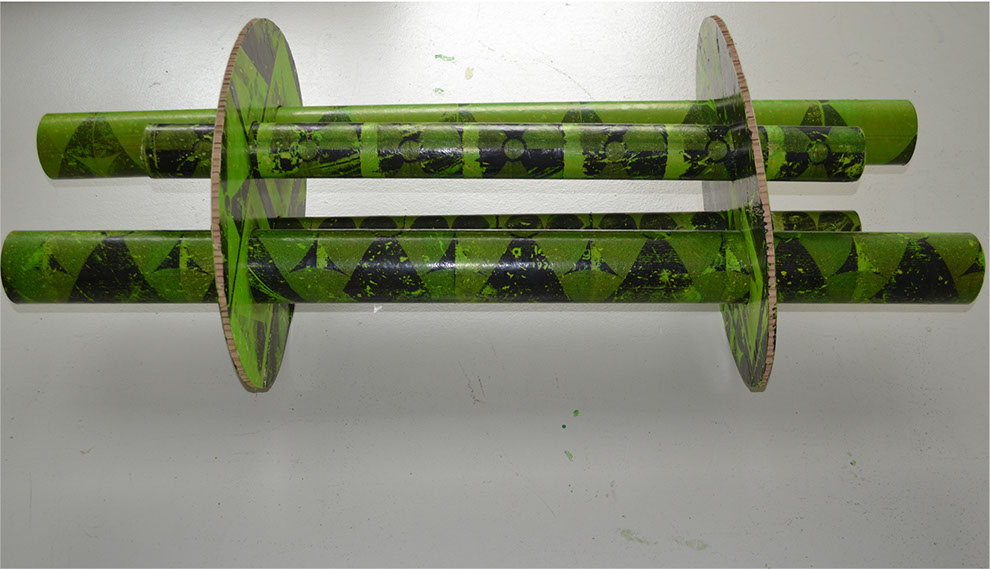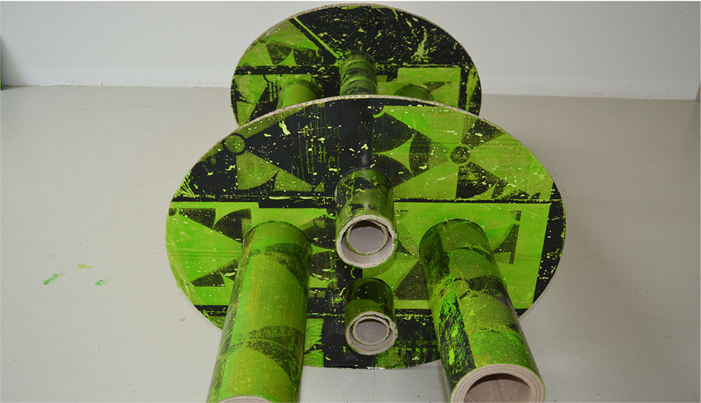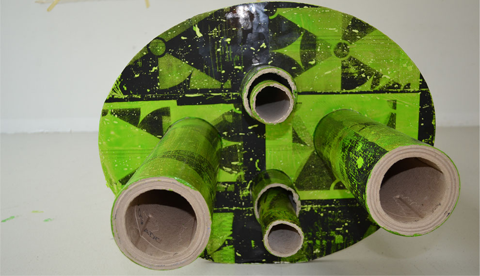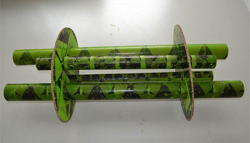 Graphitmonotypie mit grün gefärbtem Buchbinderleim auf Teppichrollkernen,