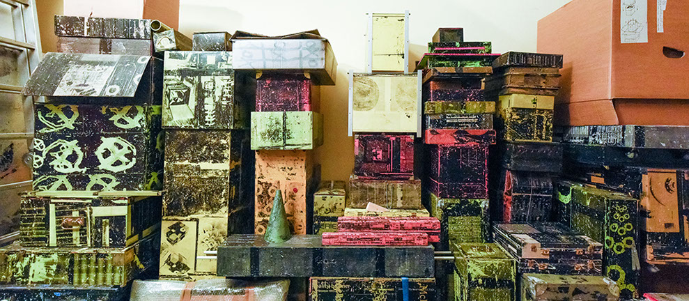 Verpacken: Die Verpackungen beziehen sich auf ihren Inhalt. Insgesamt ergeben sie eine additive Großskulptur aus unterschiedlichen Bausteinen.